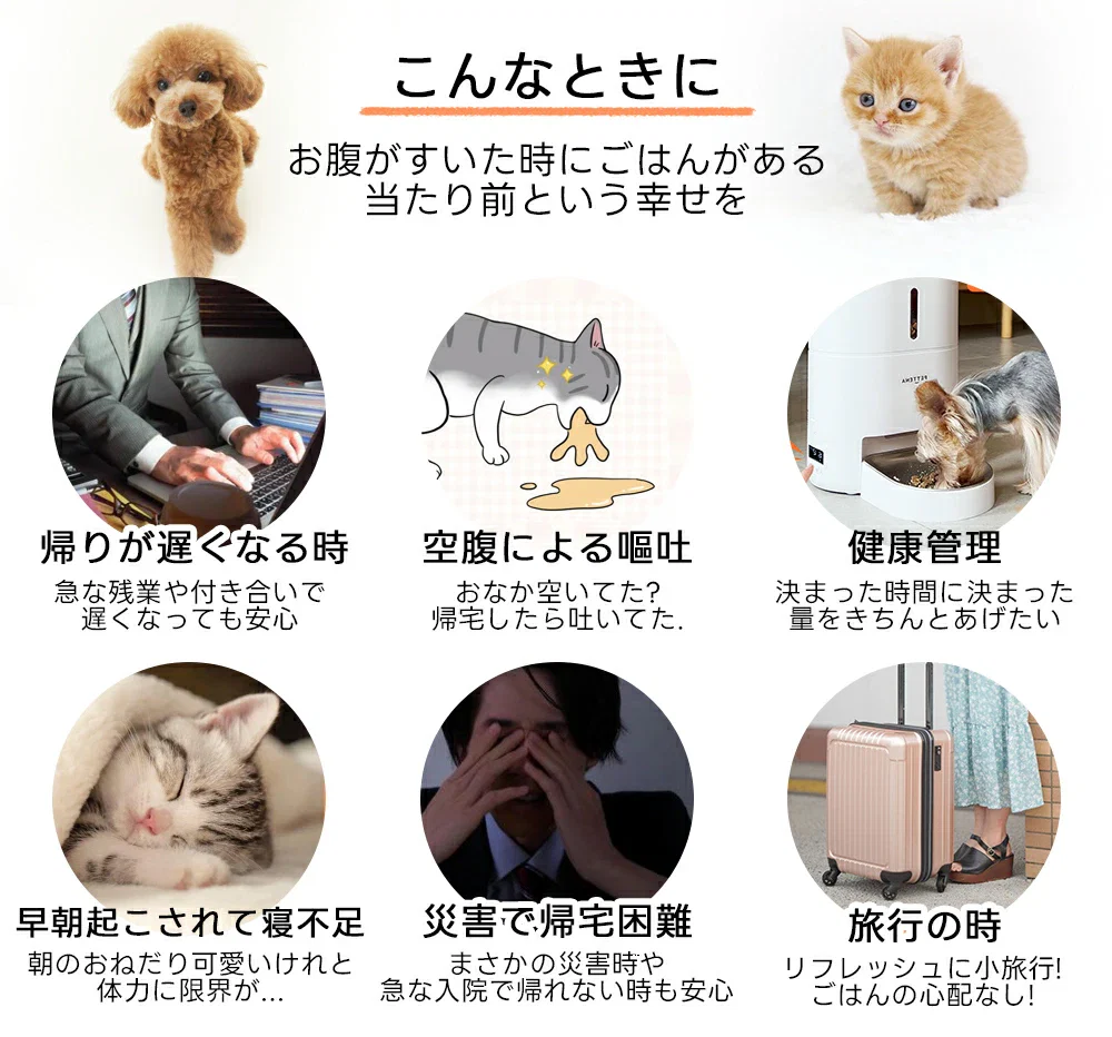 - スマホアプリ連動:給餌時間・回数・量をいつでもどこでも管理。