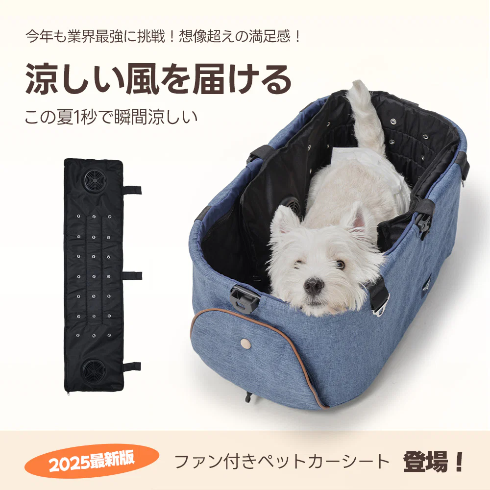 特殊設計の低騒音モーターを採用。運転音はささやかで、聴覚の敏感なペットもリラックスしたまま。風切り音も抑えた設計で、移動中の眠りや休息を邪魔しません。静けさの中での快適冷却を実現します。